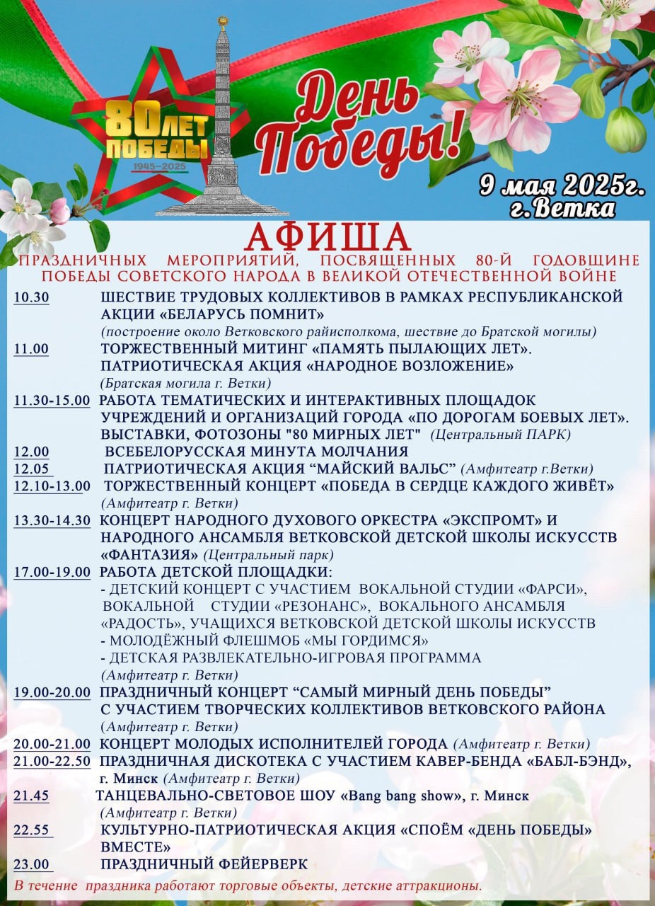 ОБЩЕСТВОАфиша праздничных мероприятий, посвящённых 80-й годовщине Победы советского народа в Великой Отечественной войне vetka06.05.202501 минуты 7 Просмотров Навигация по записям Предыдущая: Минобразования определило, победители каких олимпиад смогут стать первокурсниками без испытанийСледующая: ПРЯМАЯ ЛИНИЯ Добавить комментарий Отменить ответВаш адрес email не будет опубликован. Обязательные поля помечены *Комментарий * Имя * Email * Сайт Сохранить моё имя, email и адрес сайта в этом браузере для последующих моих комментариев.