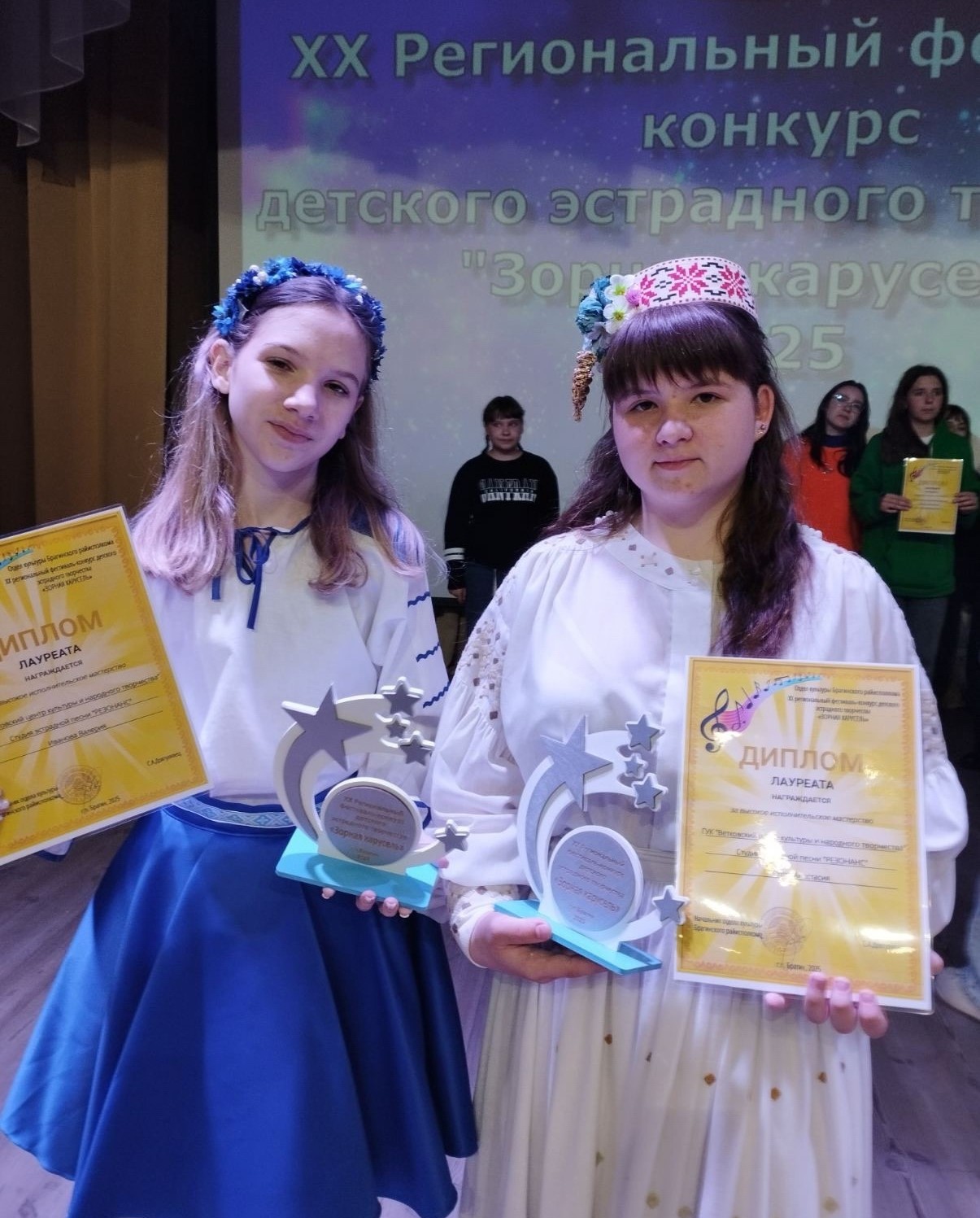 За высокое исполнительское мастерство дипломами лауреата награждены участники эстрадной студии «Резонанас» Ветковского центра культуры и народного творчества Иванова Валерия и Гутор Анастасия.