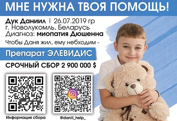 Сейчас Даниил нуждается в дорогостоящем препарате Элевидис – единственный препарат в мире, который способен остановить течение недуга. Стоимость препарата непомерно высока – 2 900 000 долларов США.