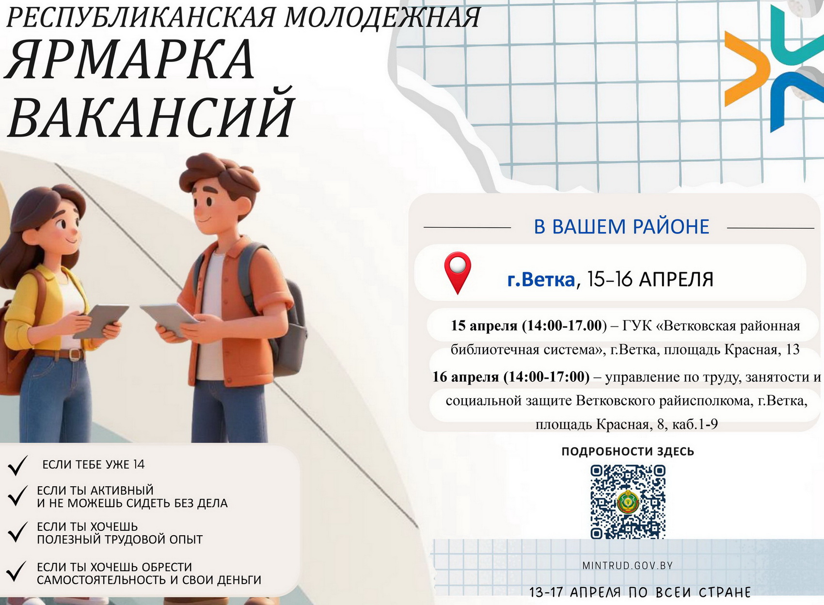 15 апреля с 14.00 до 17.00 на базе ГУК «Ветковская районная библиотечная система» (г. Ветка, пл. Красная, д. 13), состоится молодёжная ярмарка вакансий по вопросу трудоустройства выпускников учебных заведений и учащейся молодёжи в свободное от учебы время.