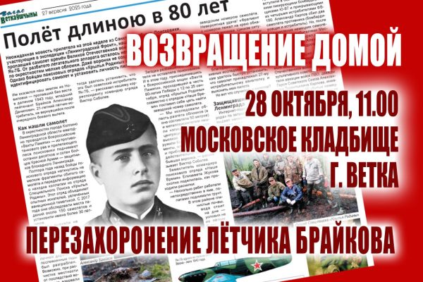 28 октября в Ветке состоится перезахоронение останков советского лётчика-истребителя, погибшего в марте 1943 года при защите блокадного Ленинграда. Более 80 лет гвардии младший лейтенант Александр Брайков, уроженец деревни Новиловка Светиловичского (ныне — Ветковского) района, считался пропавшим без вести. Российским поисковикам в рамках Всероссийской экспедиции «Ленинградский фронт» 18 сентября 2025 года удалось обнаружить обломки советского истребителя…